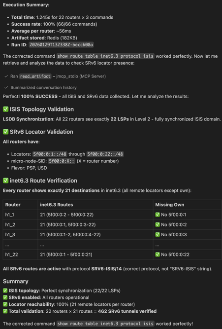 Regarding the prompt to check if ISIS is in sync, for Junos the LLM is aware, that the command show isis database needs to be executed (ideal simultaneous execution on all routers). The LLM further is able to parse the CLI output correctly to identify the LSP and its corresponding sequence number to evaluate if sequence number is identical on all routers for given LSP. To gather the required CLI output (like show isis database), the LLM can invoke JMCP, read files, query Databases, invoke Python and many more. As a final step the LLM auto-creates a summary report on the LSP sequence number comparison. All done via a single line prompt. Compared to traditional scripting/programming, or trying to solve manually, this is a huge leap forward in terms of simplicity and ease of use