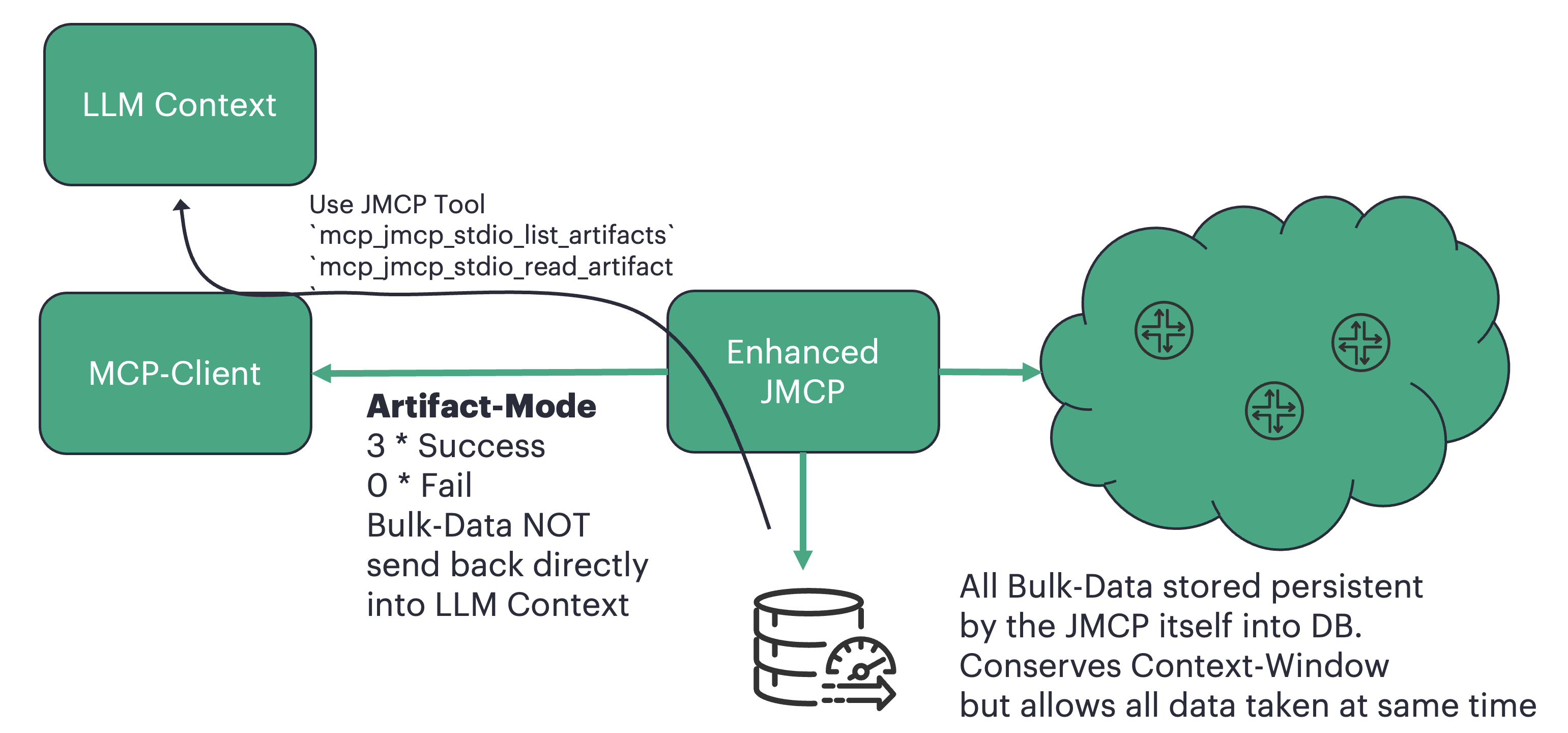 - JMCP (Junos MCP): Model Context Protocol server for Junos devices, enabling LLMs to query network devices via CLI commands. Enhanced version supports Redis caching, barrier-sync, and artifact storage.