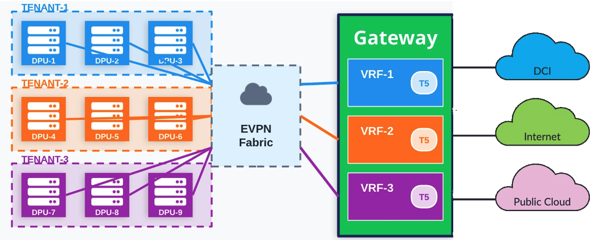 - At the server: The DPU handles all tenant isolation and encapsulates traffic into EVPN Type-5 VXLAN tunnels.