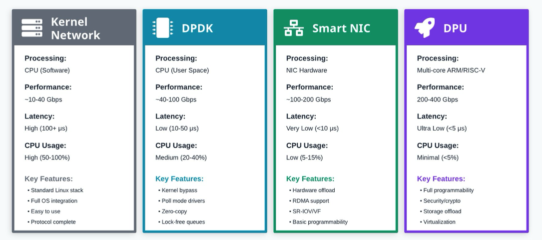 - DPU: Complete infrastructure offload at 200-400 Gbps, ultra-low latency (<5 µs), host CPU practically freed (<5%)
