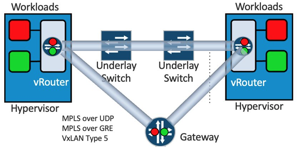 Back in 2018, I was working with Juniper Networks customers designing and deploying telco and IT private clouds. The dominant approach back then was straightforward - virtual routers running as kernel modules. These vRouters, particularly Juniper's Contrail platform, connected virtual workloads to physical networks using overlay tunnels. We relied heavily on MPLS over GRE, and later MPLS over UDP, to create isolated tenant networks. The tunnels ran from vRouter to Gateway (or border node), while the Data Center fabric served purely as transport.