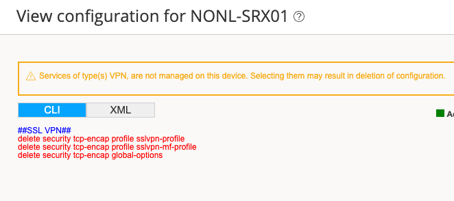 I removed an old, and unused VPN from Security Director and then had to remove some of the config manually, per JTAC support. I only removed lines that contained the name of the specific VPN. Now, when I double check that Sec DIr and the CLI agree, in Security Director, where you can preview the changes in the Devices section, I see it wants to remove three sections of code from a section under Security->tcp-encap. I've looked at my other VPNs and they use the profile defined in that section, so I don't want to let Sec Dir remove it. I want to add that back to Sec Dir, but I can't find where to do that. Here is the section of code: